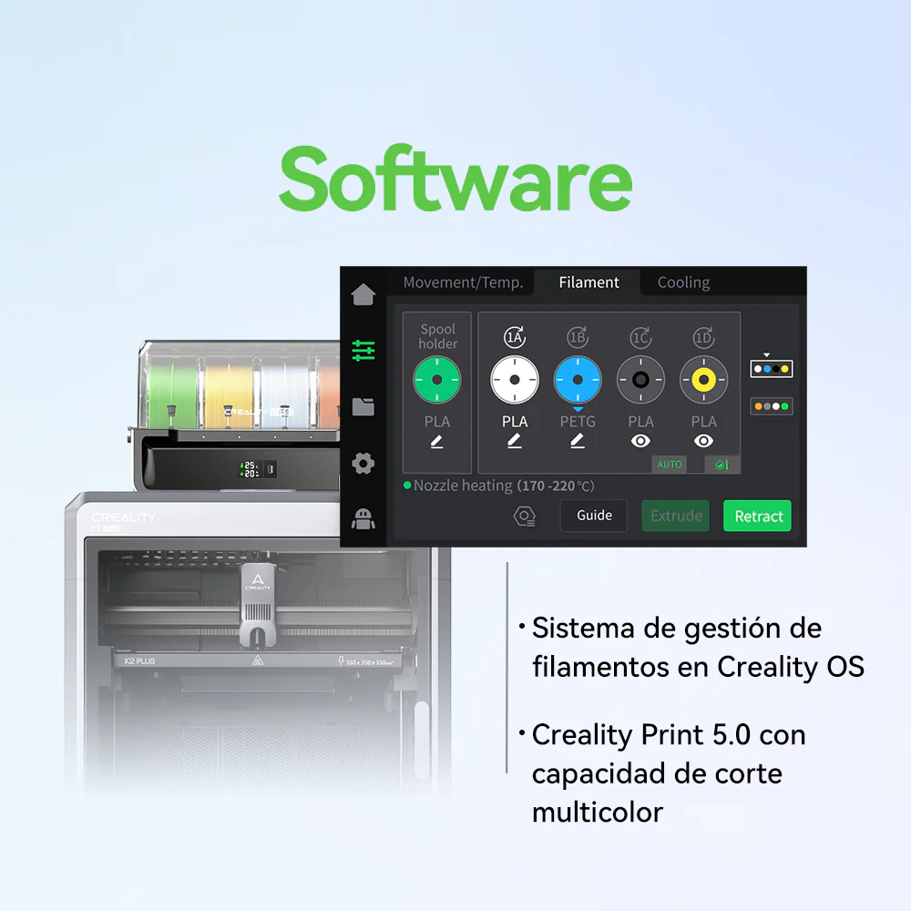 Con una configuración 95 % lista para usar, funciones de seguridad integradas y un enfoque claro en productividad, la Creality K2 Plus Combo es una solución ideal para prototipado avanzado, producción de piezas grandes y proyectos multicolor de nivel profesional.